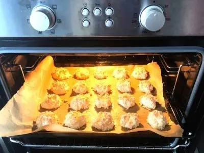 - Backe die Kokosmakronen 20 Minuten lang und schaue gegen Ende des Backvorgangs nach, ob sie nicht zu schnell braun werden. Nimm das Backblech aus dem Ofen und lasse sie darauf vollständig auskühlen.