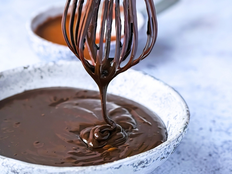 - Hacke die Kuvertüre grob, gib sie in die Schüssel und schmilz sie über dem Wasserbad langsam unter Rühren. Jetzt das Pflanzenöl langsam unterrühren, so ergibt es den schönen Glanz.