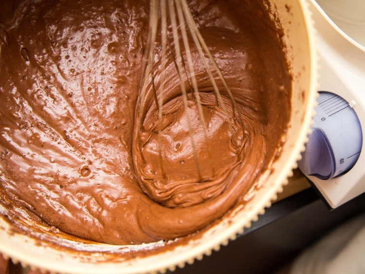 - Die Mehlmischung nach und nach zur Buttermischung geben. Dabei immer etwas Kaffee und Milch mit hineinrühren und locker unterrühren.Sobald alle Zutaten in der Schüssel sind und locker vermengt, aufhören. Es können ruhig noch weiße Teigspitzen zu sehen sein. Zu langes Rühren macht den Teig hart.